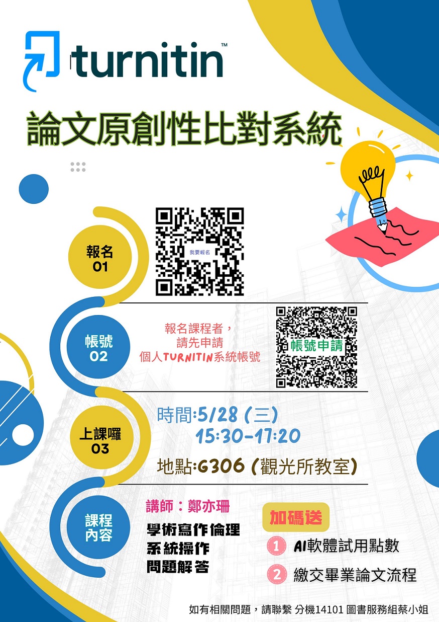 目前各研究所已將turnitin 論文原創性系統納入學位考試流程,圖書館會在每年5月舉辦教育訓練,建議預計今年7月或明年1月畢業的研究生踴躍參加
